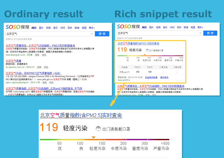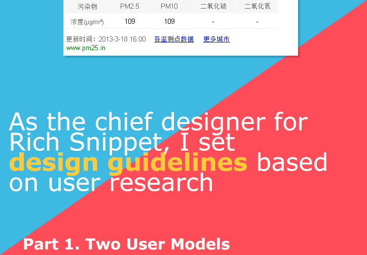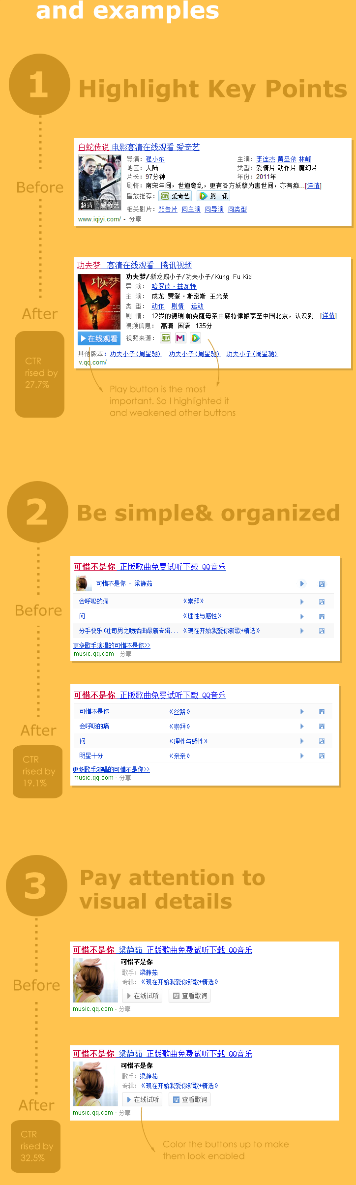 As the chief designer for China's third largest search engine, I designed and redesigned over 100 web-based rich snippets, devoted to the consistency across different snippets, and creating design guidelines. I also worked for the mobile rich snippets. Here I am showing a brief outline of my design philosophy for the web-based rich snippets. Click here for a much more detailed collection and synthesis of my work.